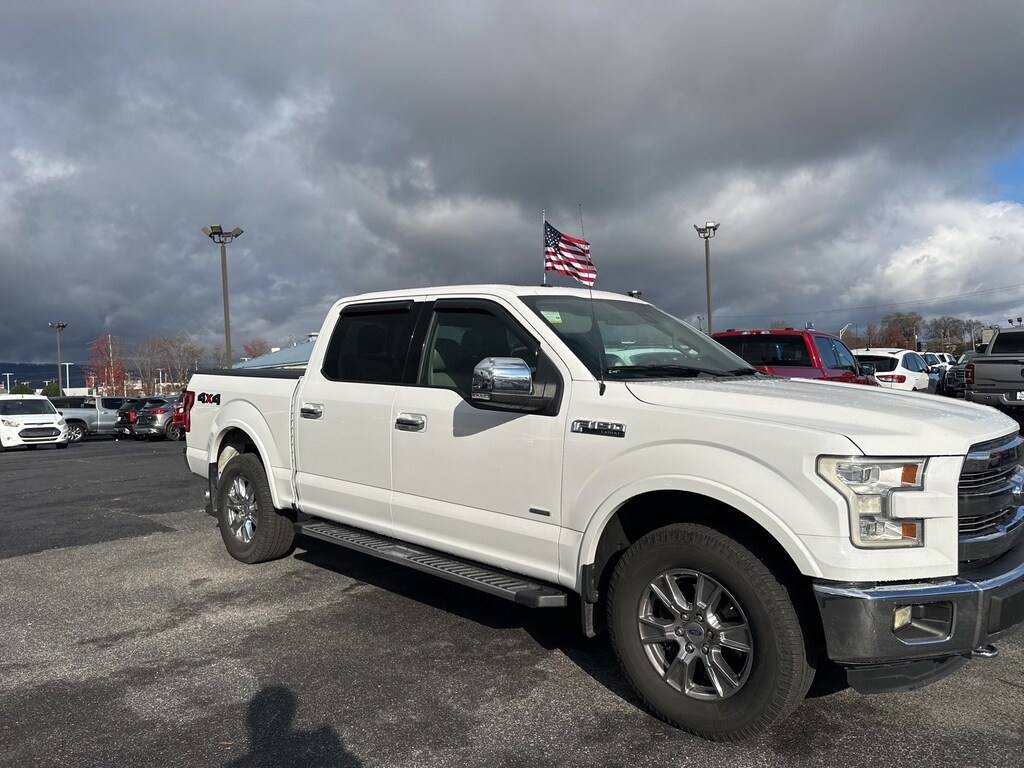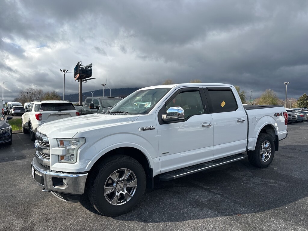 2015 Ford F-150 Lariat 4WD, 18" Machined-Aluminum Wheels, 4-Wheel Disc Brakes, 7 Speakers, ABS brakes, Adjustable pedals, Air Conditioning, Alloy wheels, AM/FM radio: SiriusXM, Auto-dimming door mirrors, Auto-dimming Rear-View mirror, Automatic temperature control, Brake assist, Bumpers: chrome, CD player, Class IV Trailer Hitch Receiver, Compass, Cruise Control, Delay-off headlights, Driver door bin, Driver vanity mirror, Dual front impact airbags, Dual front side impact airbags, Electronic Stability Control, Front anti-roll bar, Front Center Armrest w/Storage, Front dual zone A/C, Front fog lights, Front reading lights, Front wheel independent suspension, Fully automatic headlights, Heated and Cooled Seats, Heated door mirrors, Illuminated entry, Leather-Trimmed 40/20/40 Front Seat, Low tire pressure warning, Memory seat, Occupant sensing airbag, Outside temperature display, Overhead airbag, Overhead console, Panic alarm, Passenger door bin, Passenger vanity mirror, Pedal memory, Power door mirrors, Power driver seat, Power passenger seat, Power steering, Power windows, Radio data system, Radio: Single-CD w/SiriusXM Satellite, Rear reading lights, Rear seat center armrest, Rear step bumper, Rear window defroster, Rearview Camera, Remote keyless entry, Security system, Speed-sensing steering, Split folding rear seat, Steering wheel mounted audio controls, SYNC with MyFord Touch, Tachometer, Telescoping steering wheel, Tilt steering wheel, Traction control, Trip computer, Turn signal indicator mirrors, Variably intermittent wipers, Ventilated front seats, Voltmeter, (Must finance with Ford Motor Credit to receive online pricing - see dealer for details.) Proudly, 4WD. Oxford White Awards: