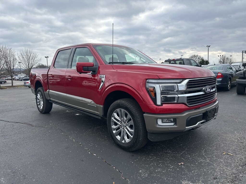2025 Ford F-150 King Ranch 3.5L PowerBoost Full-Hybrid V6, 4WD, 14 Speakers, 4-Wheel Disc Brakes, ABS brakes, Adjustable pedals, Air Conditioning, Alloy wheels, AM/FM radio: SiriusXM with 360L, Auto High-beam Headlights, Auto tilt-away steering wheel, Auto-dimming door mirrors, Auto-dimming Rear-View mirror, Automatic temperature control, Brake assist, Chrome wheels, Compass, Cruise Control, Delay-off headlights, Driver door bin, Driver vanity mirror, Dual front impact airbags, Dual front side impact airbags, Electronic Locking w/3.55 Axle Ratio, Electronic Stability Control, Emergency communication system: SYNC 4 911 Assist, Front anti-roll bar, Front Bucket Seats, Front Center Armrest, Front dual zone A/C, Front fog lights, Front reading lights, Front wheel independent suspension, Fully automatic headlights, Garage door transmitter, Genuine wood dashboard insert, Heads-Up Display, Heated and Cooled Seats, Heated door mirrors, Heated rear seats, Heated steering wheel, Illuminated entry, Internet access capable: FordPass Connect 5G, King Ranch Multicontour Leather Bucket Seats, Leather steering wheel, Low tire pressure warning, Memory seat, Navigation system: Connected Navigation, Occupant sensing airbag, Outside temperature display, Overhead airbag, Overhead console, Panic alarm, Passenger door bin, Passenger vanity mirror, Pedal memory, Power door mirrors, Power driver seat, Power moonroof, Power passenger seat, Power steering, Power windows, Radio data system, Radio: B&O Unleashed Sound System by Bang & Olufsen, Rain sensing wipers, Rear reading lights, Rear seat center armrest, Rear step bumper, Rear window defroster, Remote keyless entry, Security system, Split folding rear seat, Steering wheel memory, Steering wheel mounted audio controls, SYNC 4 w/Enhanced Voice Recognition, Tachometer, Telescoping steering wheel, Tilt steering wheel, Traction control, Trip computer, Turn signal indicator mirrors, Variably intermittent wipers, Ventilated front seats, Voltmeter, Wheels: 20" Chrome-Like PVD, (Must finance with Ford Motor Credit to receive online pricing - see dealer for details.) Proudly, 3.5L PowerBoost Full-Hybrid V6, 4WD. Red 10-Speed Automatic