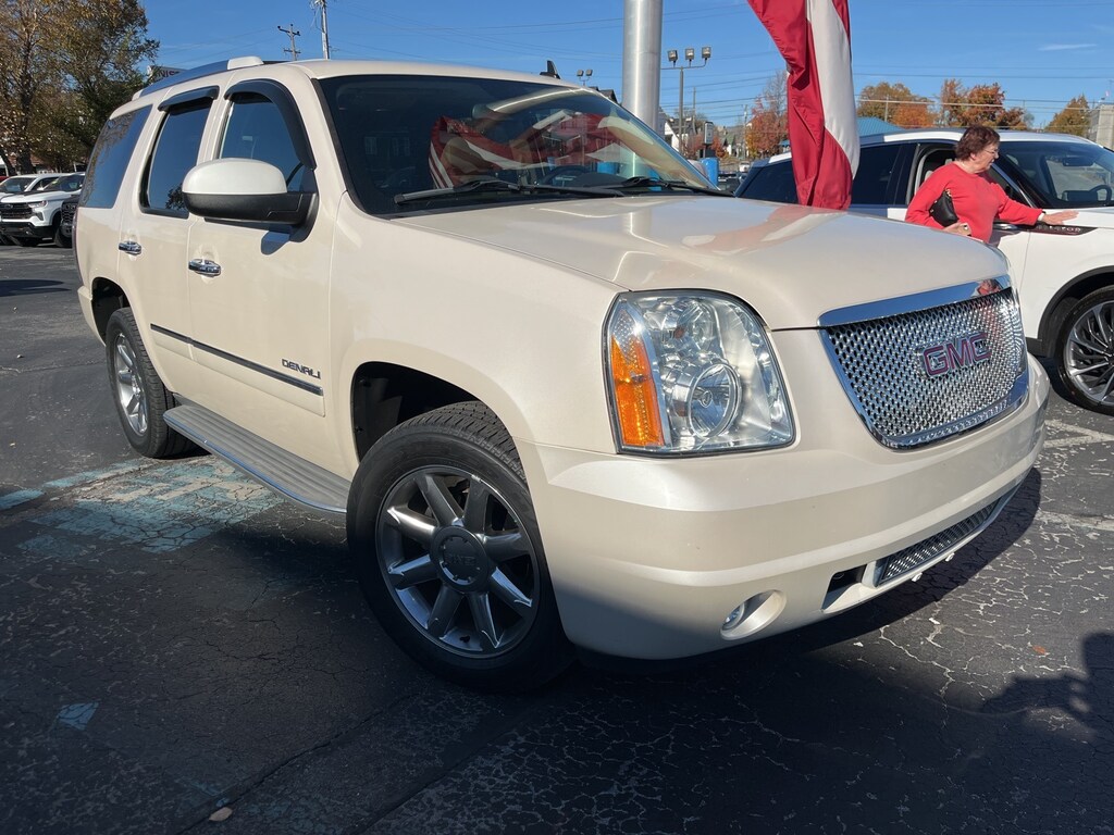 2014 GMC Yukon Denali Yukon Denali, 4D Sport Utility, Vortec 6.2L V8 SFI VVT Flex Fuel, 6-Speed Automatic Electronic with Overdrive, RWD, White Diamond Tricoat, Cocoa/Light Cashmere w/Perforated Nuance Leather-Appointed Seat Trim, 2nd Row Power Seat Release Only, 2nd Row Reclining Captain's Bucket Seats, Automatic Air Level Control, Autoride Suspension Package, Auxiliary External Transmission Oil Cooler, Body-Color Power-Adjustable Heated Outside Mirrors, Color-Keyed Heated Leather-Wrapped Steering Wheel, Denali Package, Heated & Cooled Driver & Front Passenger Seats, Heated 2nd Row Seats, Heavy-Duty Air-to-Oil External Engine Oil Cooler, Inside Rear-View Auto-Dimming Mirror, License Plate Front Mounting Package, Navigation System, Power Liftgate, Power Tilt-Sliding Sunroof w/Express-Open/Close, Rear Power-Operated Liftgate, Rear-Seat DVD Player Entertainment System, Side Blind Zone Alert, 10 Speakers, 20" x 8.5" Chrome Aluminum Wheels, 3.42 Rear Axle Ratio, 3rd row seats: split-bench, 4-Wheel Disc Brakes, ABS brakes, Adjustable pedals, Air Conditioning, Alloy wheels, AM/FM radio: SiriusXM, Auto-dimming door mirrors, Auto-dimming Rear-View mirror, Auto-leveling suspension, Automatic temperature control, Bodyside moldings, Bumpers: body-color, CD player, Chrome wheels, Compass, Cruise Control, Delay-off headlights, Driver door bin, Driver vanity mirror, Dual front impact airbags, Dual front side impact airbags, DVD-Audio, Electronic Stability Control, Emergency communication system: OnStar Directions & Connections, Floor Console w/Storage Area, Front anti-roll bar, Front Bucket Seats, Front Center Armrest, Front dual zone A/C, Front fog lights, Front Full-Feature Reclining Bucket Seats, Front reading lights, Front wheel independent suspension, Fully automatic headlights, Garage door transmitter, Heated and Cooled Seats, Heated door mirrors, Heated rear seats, Heated steering wheel, Illuminated entry, Leather Shift Knob, Leather steering wheel, Low tire pressure warning, Memory seat, NavTraffic, Occupant sensing airbag, Outside temperature display, Overhead airbag, Overhead console, Panic alarm, Passenger door bin, Passenger vanity mirror, Pedal memory, Perforated Nuance Leather-Appointed Seat Trim, Power door mirrors, Power driver seat, Power passenger seat, Power steering, Power windows, Radio data system, Radio: AM/FM/SiriusXM Stereo w/CD/Navigation, Rear air conditioning, Rear anti-roll bar, Rear audio controls, Rear Cargo Mat, Rear reading lights, Rear Vision Camera, Rear window defroster, Rear window wiper, Rearview Camera, Remote keyless entry, Roof rack, Security system, SiriusXM Satellite Radio, Split folding rear seat, Spoiler, Steering wheel memory, Steering wheel mounted audio controls, Tachometer, Tilt steering wheel, Traction control, Trip computer, Turn signal indicator mirrors, USB Port, Variably intermittent wipers, Ventilated front seats, Voltmeter, (Must finance with Ford Motor Credit to receive online pricing - see dealer for details.) Proudly, Yukon Denali, 4D Sport Utility, Vortec 6.2L V8 SFI VVT Flex Fuel, 6-Speed Automatic Electronic with Overdrive, RWD, White Diamond Tricoat, Cocoa/Light Cashmere w/Perforated Nuance Leather-Appointed Seat Trim, 2nd Row Power Seat Release Only, 2nd Row Reclining Captain's Bucket Seats, Automatic Air Level Control, Autoride Suspension Package, Auxiliary External Transmission Oil Cooler, Body-Color Power-Adjustable Heated Outside Mirrors, Color-Keyed Heated Leather-Wrapped Steering Wheel, Denali Package, Heated & Cooled Driver & Front Passenger Seats, Heated 2nd Row Seats, Heavy-Duty Air-to-Oil External Engine Oil Cooler, Inside Rear-View Auto-Dimming Mirror, License Plate Front Mounting Package, Navigation System, Power Liftgate, Power Tilt-Sliding Sunroof w/Express-Open/Close, Rear Power-Operated Liftgate, Rear-Seat DVD Player Entertainment System, Side Blind Zone Alert. White Diamond Tricoat Awards: