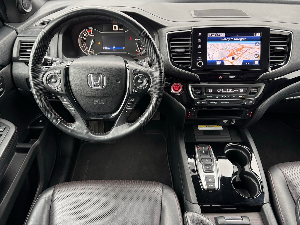 2022 Honda Ridgeline Black Edition Black w/Perforated Leather Seat Trim, 4-Wheel Disc Brakes, 4.33 Axle Ratio, 8 Speakers, ABS brakes, Air Conditioning, Alloy wheels, AM/FM radio: SiriusXM, Apple CarPlay/Android Auto, Auto High-beam Headlights, Auto-dimming Rear-View mirror, Automatic temperature control, Blind Spot Information (BSI) System warning, Bluetooth® Hands-Free Link, Brake assist, Bumpers: body-color, Compass, Cruise Control, Delay-off headlights, Driver door bin, Driver vanity mirror, Driver's Seat Mounted Armrest, Dual front impact airbags, Dual front side impact airbags, Electronic Stability Control, Forward collision: Collision Mitigation Braking System (CMBS) + FCW mitigation, Four wheel independent suspension, Front anti-roll bar, Front Bucket Seats, Front dual zone A/C, Front fog lights, Front reading lights, Fully automatic headlights, Garage door transmitter: HomeLink, Heated and Cooled Seats, Heated door mirrors, Heated Front Bucket Seats, Heated steering wheel, Honda Satellite-Linked Navigation System, Illuminated entry, Low tire pressure warning, Memory seat, Navigation system: Honda Satellite-Linked Navigation System, Occupant sensing airbag, Outside temperature display, Overhead airbag, Overhead console, Panic alarm, Passenger door bin, Passenger seat mounted armrest, Passenger vanity mirror, Perforated Leather Seat Trim, Power door mirrors, Power driver seat, Power moonroof, Power passenger seat, Power steering, Power windows, Radio data system, Radio: 540-Watt Premium Audio System w/8 Speakers, Rear air conditioning, Rear anti-roll bar, Rear reading lights, Rear seat center armrest, Rear step bumper, Rear window defroster, Rearview Camera, Remote keyless entry, Security system, SiriusXM, Speed-sensing steering, Split folding rear seat, Steering wheel mounted audio controls, Tachometer, Telescoping steering wheel, Tilt steering wheel, Traction control, Trip computer, Turn signal indicator mirrors, Variably intermittent wipers, Wheels: 18" Exclusive Gloss Black Alloy, (Must finance with Ford Motor Credit to receive online pricing - see dealer for details.) Proudly, Black w/Perforated Leather Seat Trim. Sonic Gray Pearl 9-Speed Automatic Clean CARFAX. CARFAX One-Owner.
